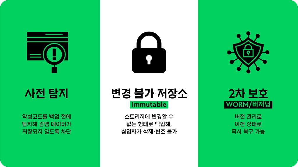 과거에 단순히 데이터를 백업해 두는 것이 목적이었다면 지금의 백업은 랜섬웨어 같은 위협으로부터 데이터를 보호해야 하고, 또 주 서비스가 공격을 당했을 시에 데이터를 안전하게 보존하고 또 빠르게 복구할 수 있어야 하다 보니, 백업이 핵심 이슈로 부상하게 되었습니다.