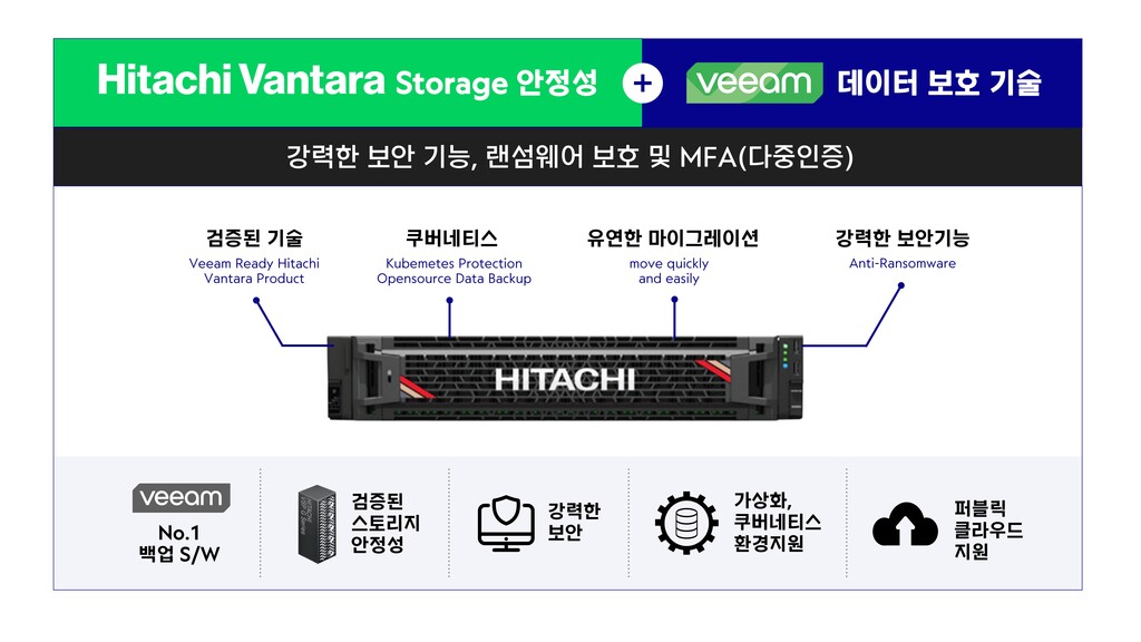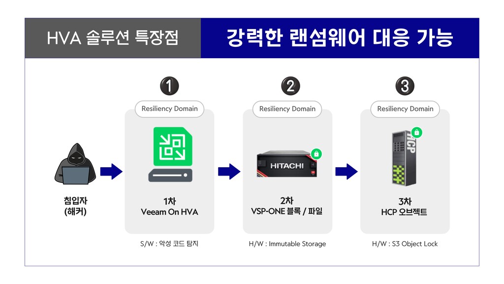 첫 번째 특징은 막강한 랜섬웨어 보호 기능이라고 볼 수 있을 텐데요. 랜섬웨어는 하나의 포인트 솔루션으로는 막아내기 어렵습니다. 그래서 HVA는 Veeam의 AI 기반 이상행위 탐지를 통해 랜섬웨어를 사전 감지하고, Hitachi 스토리지의 Immutable 저장소로 변경 불가능하게 저장하며, HCP 오브젝트 스토리지를 활용한 3단계 보호까지 제공하는 프로세스를 가지고 있습니다. AI 탐지 – 변경불가 저장 – WORM 기반 보존이라는 입체적 대응 구조가 돋보인다고 할 수 있겠네요.