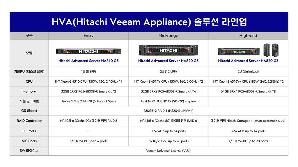 백업을 위한 성능과 용량을 기준으로 엔트리, 미드레인지, 하이엔드 등 총 3가지로 저희가 모델을 제공해 드리고 있습니다. 편의상 용량 기준으로 생각하시면 되고, 고객 상황에 따라서 커스터마이징도 가능하도록 설계가 되어 있습니다.
