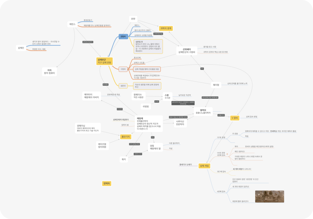 - 얼마 전에 삼체를 읽었는데, 등장 인물들도 워낙 많고 또 이름이 중국 이름이다 보니 낯설기도 하고, 여튼 이름을 기억하기 쉽지 않더라구요. 그래서 저는 삼체의 인물도를 마인드맵으로 정리를 했습니다. 인물간의 관계를 파악하고, 등장 인물의 성격과 면모를 파악하기 아주 편리합니다. 모르긴 해도 소설가들도 이런 방식으로 인물도를 그려가면서 소설을 쓰지 않을까요?