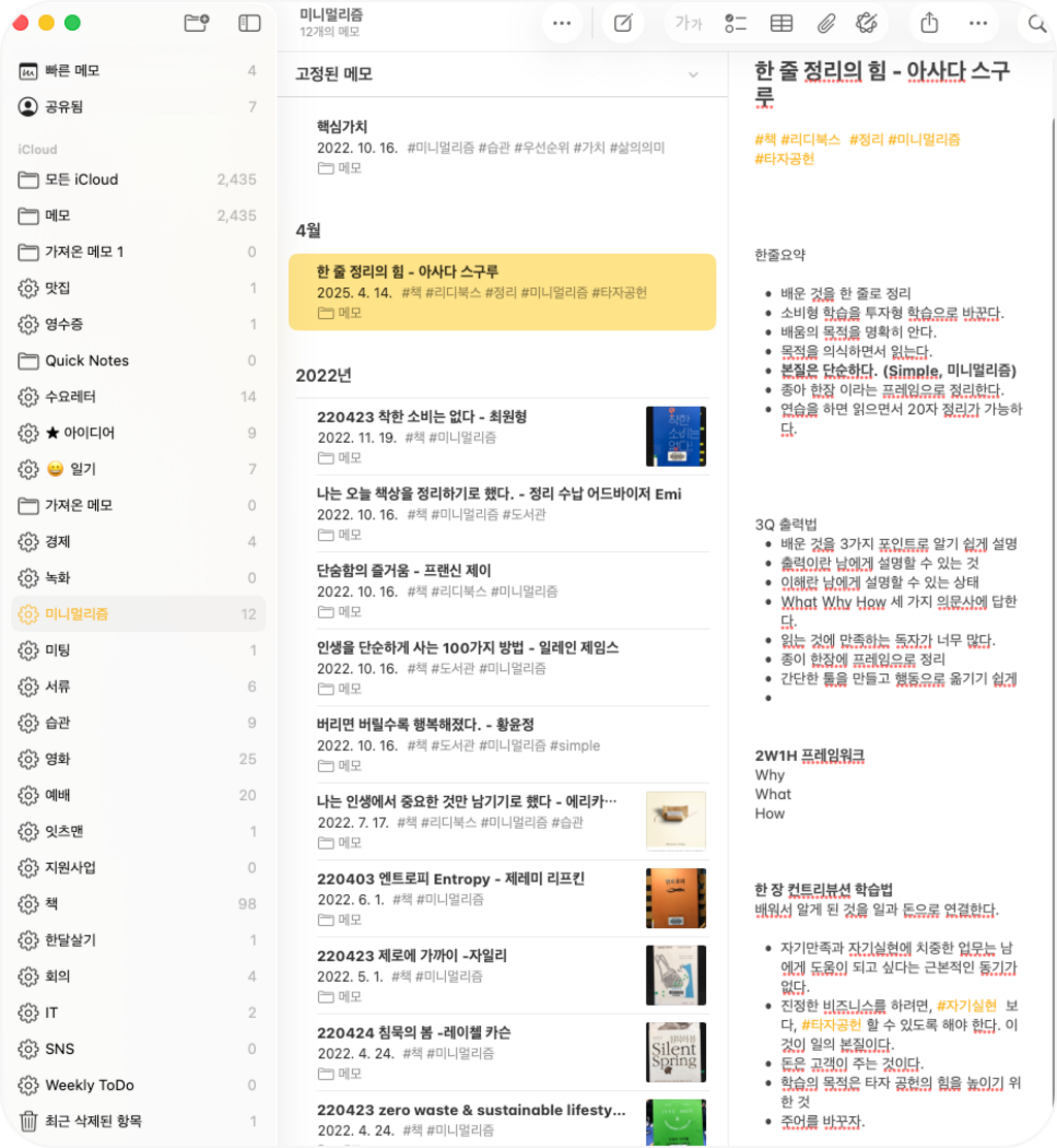 - 하나는 에버노트와 같은 이유인데요. 메모가 수천 개가 넘어가고 용량도 커져가면서 메모앱이 많이 느려졌습니다. 메모가 빠릿해야 하는데, 이게 많이 답답했죠. (사실 지금은 해당 부분이 많이 개선되었습니다. icloud의 문제라기 보다는 단말의 문제였을 수도 있습니다. 아니면 동기화 방식이 많이 개선되었을 수도 있구요)