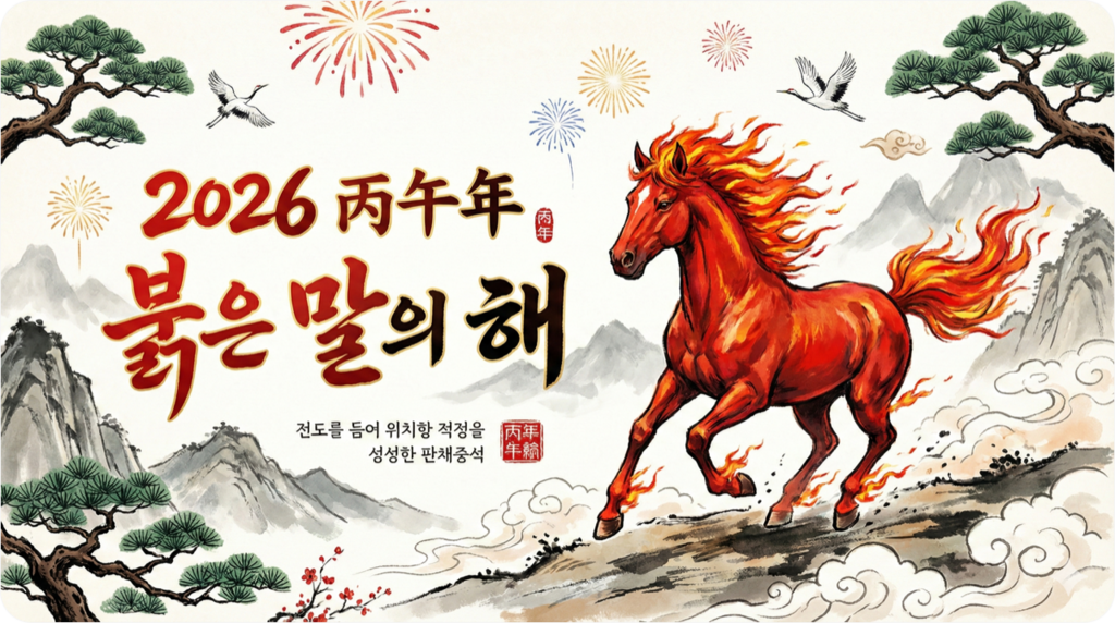 - 2026년은 병오년(丙午年), 바로 붉은 말의 해입니다. 오행에서 병(丙)은 강력한 불의 기운을, 오(午)는 역동적인 말을 상징하죠. 뜨거운 열정과 거침없이 질주하는 에너지가 결합되는 해가 바로 2026년입니다.